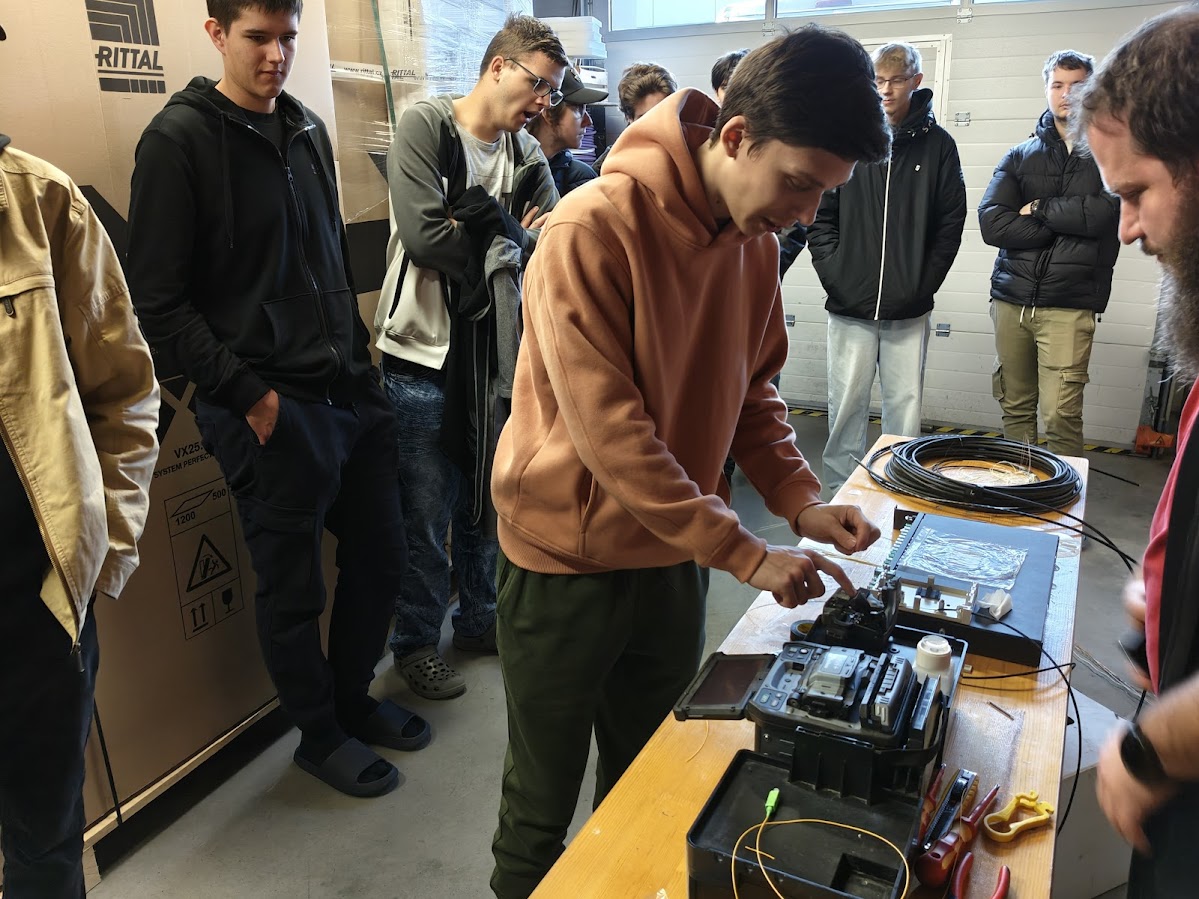 Nakonec jsme se podívali na práci s optickými kabely. Bylo nám vysvětleno, jak se optická vlákna svařují dohromady, a dokonce jsme si to mohli sami vyzkoušet. Dozvěděli jsme se také o různých druzích optických kabelů a jejich využití.