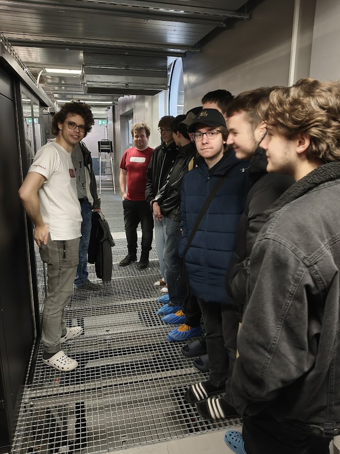 Poté jsme se přesunuli do vnitřních prostorů, kde nám ukázali dva sály se servery. První sál je klasický, kde jsou v uličkách umístěny servery v recích. Druhý modernější sál je určen pro zákazníky, kteří chtějí mít vlastní oddělený prostor pro své servery. V obou sálech jsme viděli systémy ventilace, které tvoří teplé a studené uličky. Ty zajišťují efektivní chlazení. Teplota v serverovně by se měla udržovat přibližně mezi 21–24 °C. Když je venku chladno, využívají k chlazení vzduch zvenku, což šetří energii.